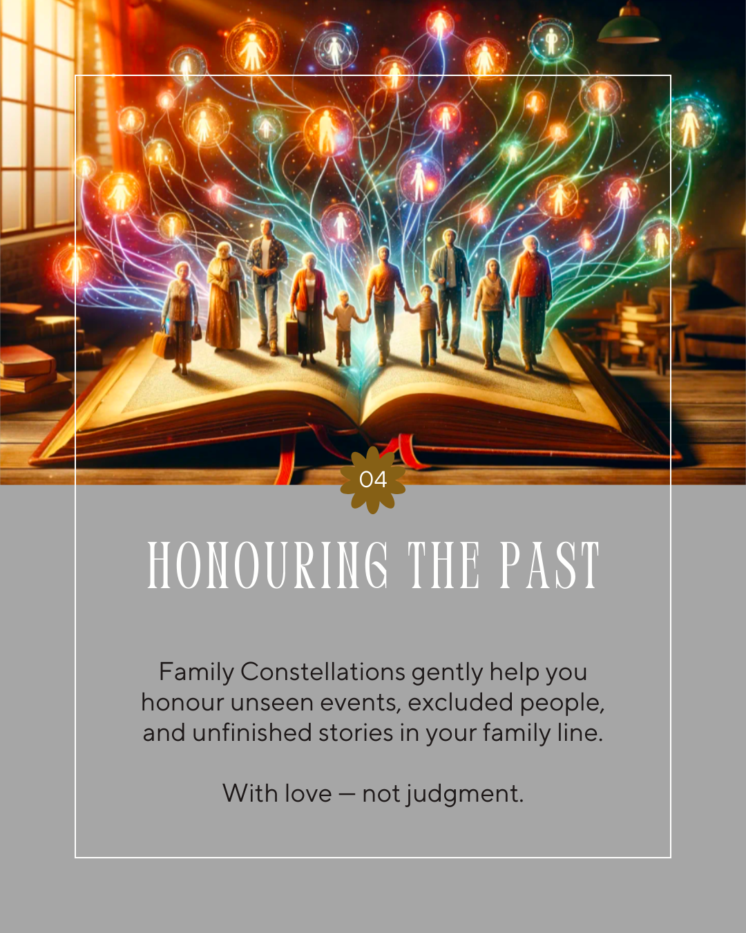 - lovingly acknowledge unseen events or excluded family members, so you can release,